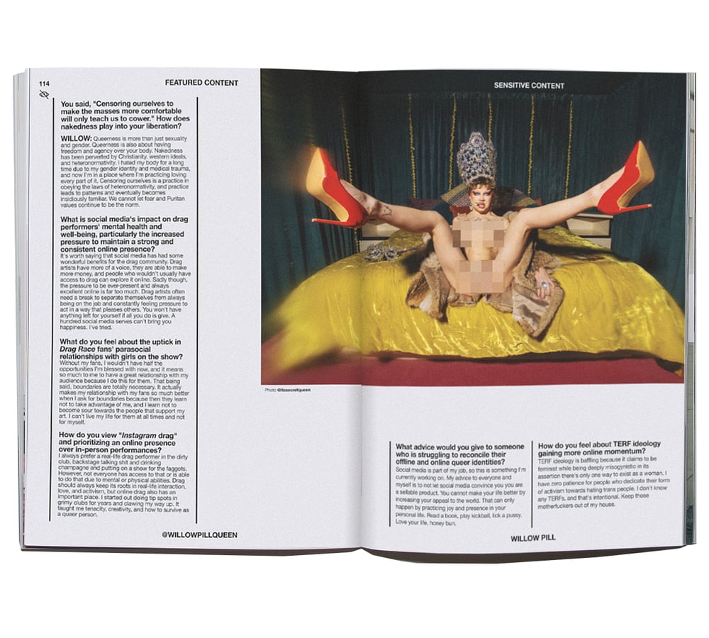Includes a curated display of art and photography from LGBTQ+ creators, which have previously been censored or removed by social media platforms. The selection spans provocative and challenging visuals to those that stimulate discourse on the thin line of online censorship and comprises the core of Sensitive Content magazine.